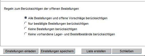 Alle Bestellungen und offenen Vorschläge berücksichtigen - Die Artikelmengen der Bestellungen und offenen Vorschläge werden, wie die Materialbestände, bereits berücksichtigt.