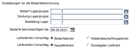 - Deckung-Lagergruppe: in dieser Lagergruppe werden die Mindestbestände, die Bestände und die offene Bestellungen abgefragt und summiert. Wurde die Option "Keine vorhandene Lager- und Bestellbestände berücksichtigen" gewählt, so wird dieses Feld leer gelassen.