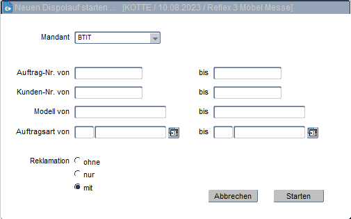 Über diese Maske wird ein neuer Dispolauf für einen Mandanten gestartet, indem alle Aufträge, deren sonstige Auftragsschritte soweit abgearbeitet wurden und den Auftragsschritt Disposition durchlaufen, für die weitere Verarbeitung selektiert werden. Hierfür kann das Ergebnis eingegrenzt werden, indem die Filter über Auftrags-Nummern, Kunden, Modelle und/oder Auftragsarten gesetzt werden. Der neue Dispolauf wird mit der Anzahl der gesamten und noch offenen (also noch nicht beschafften) Positionsmengen in der Dispositionsverwaltung angezeigt. Die gesetzten Filter werden in der Registerkarte Disposition im entsprechenden Dispolauf angezeigt.