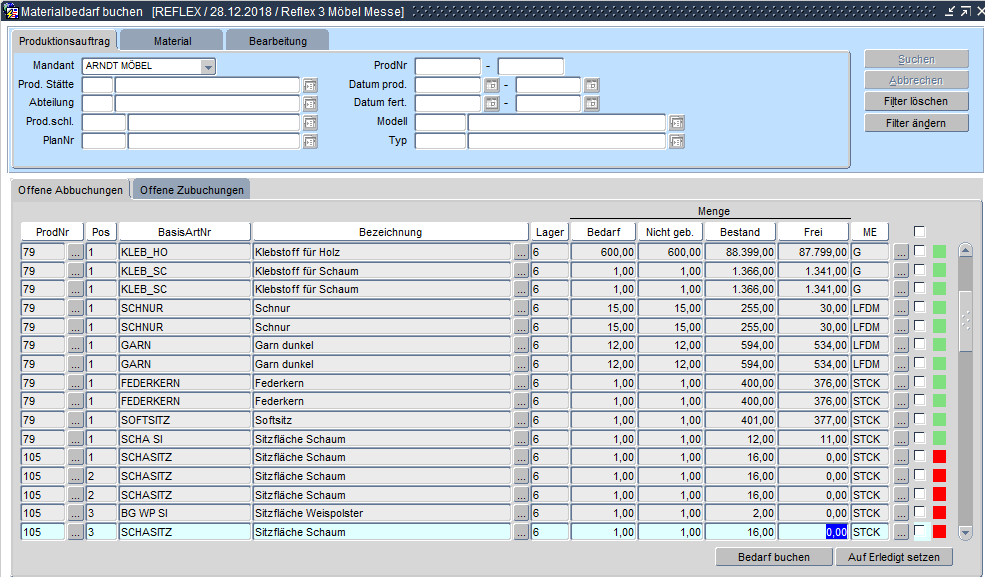 In der Form „Materialbedarfe buchen“ werden die offenen Abgangsbuchungen angezeigt. Hier handelt es sich um Materialien bei denen der Bestand aufgrund von Fertigmeldungen nicht automatisch abgebucht werden konnte. Grund dafür könnten z. B. nicht eingebuchte Wareneingänge oder falsche Stücklisten sein. Damit die Produktion nicht stoppt, weil die Materialien nicht gebucht werden können, werden diese in die Form Materialbedarf buchen geschoben. Hier muss nun analysiert werden, wie es zu diesen Fehlbuchungen gekommen ist. Waren fehlende Wareneingänge schuld, so sollten diese nun nachgebucht werden. Die Ampel erscheint grün, wenn der Buchungsvorgang erfolgen kann. War aber z. B. die Stückliste und dadurch der Bedarf falsch, so kann dieser Datensatz nach Korrektur der Stückliste einfach "auf Erledigt gesetzt" werden.