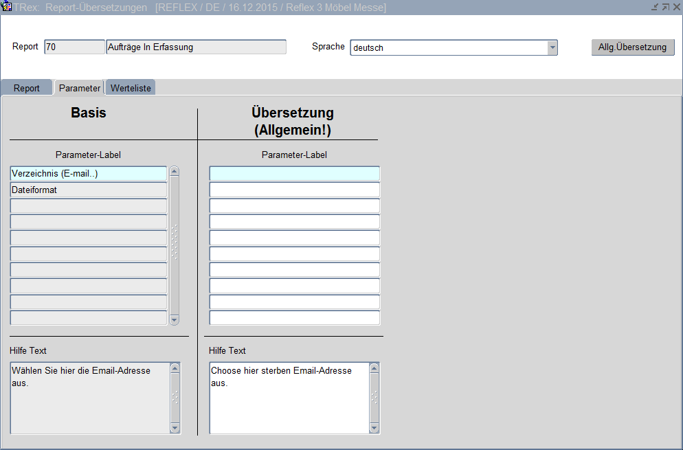 Auf dieser Karte werden die einzelnen Parameter angezeigt, die diesem Report zugeordnet wurden. Diese Übersetzungen sind nicht an dem Report gebunden sondern an der Bezeichnung des Parameters. Die Übersetzung wird als allgemeines Formmaskenobjekt „PROMPT“ in dem Formmasken-Wörterbuch hinterlegt. Daher wurde zur Hervorhebung der Zusatz „(Allgemein!)“ unter der Überschrift „Übersetzung“ mit angegeben.