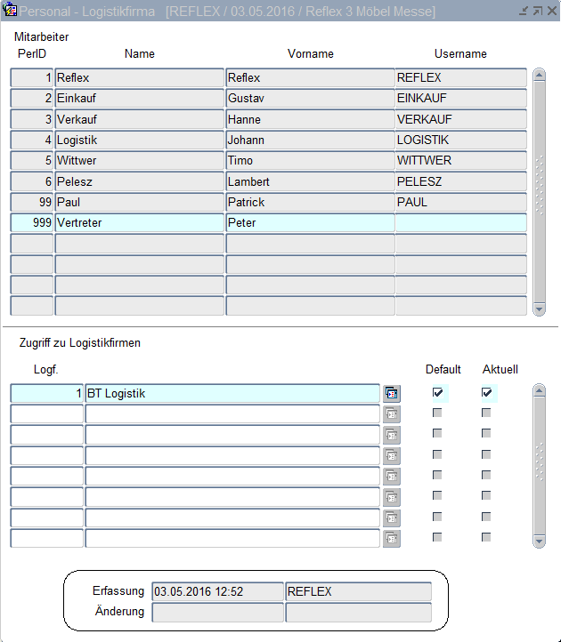 In den Personenstammdaten werden unter anderem die Personal-Nummern, Namen und Adressen der Mitarbeiter verwaltet. In diesem Modul findet die Zuordnung der Personen zu den verschiedenen Logistikfirmen statt.