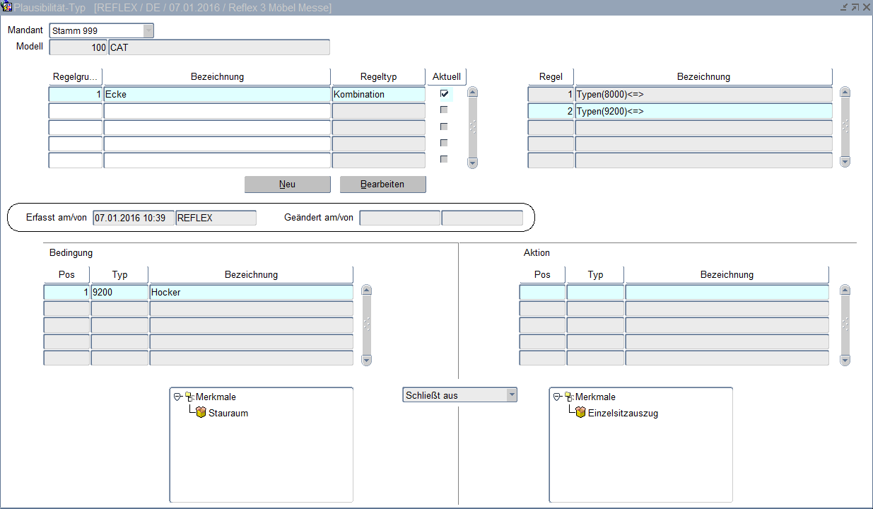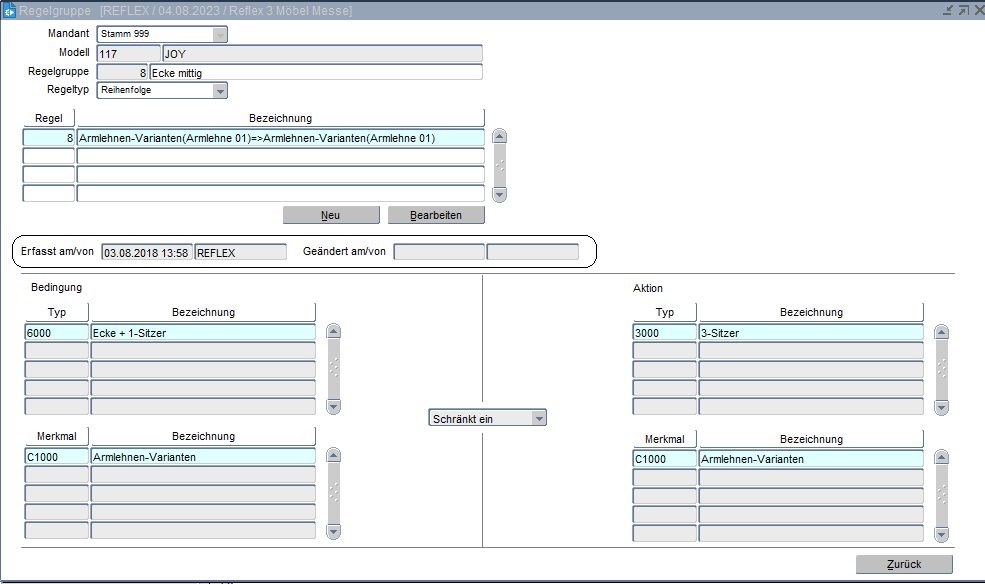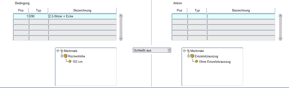 (Beispiel:Typ "Ecke links" schränkt ein - Aktion Typ "Dreisitzer AL rechts" oder Bedingung – Merkmal Fußart = „Holz, Holz mit Rollen, Holz mit Teppichrollen" schränkt ein – Aktion – Merkmal Fußfarbe = „Kirschbaum, Nussbaum, Nussbaum-antik, Buche-natur, Erle" usw.). Neue Regelwerke werden über die Schaltfläche "NEU" definiert.