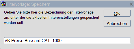 Die aktuellen Filtereinstellungen sollen gespeichert werden. Der Anwender erhält eine weitere Eingabemaske, in der er eine Bezeichnung für die Filtervorlage eingeben muss.