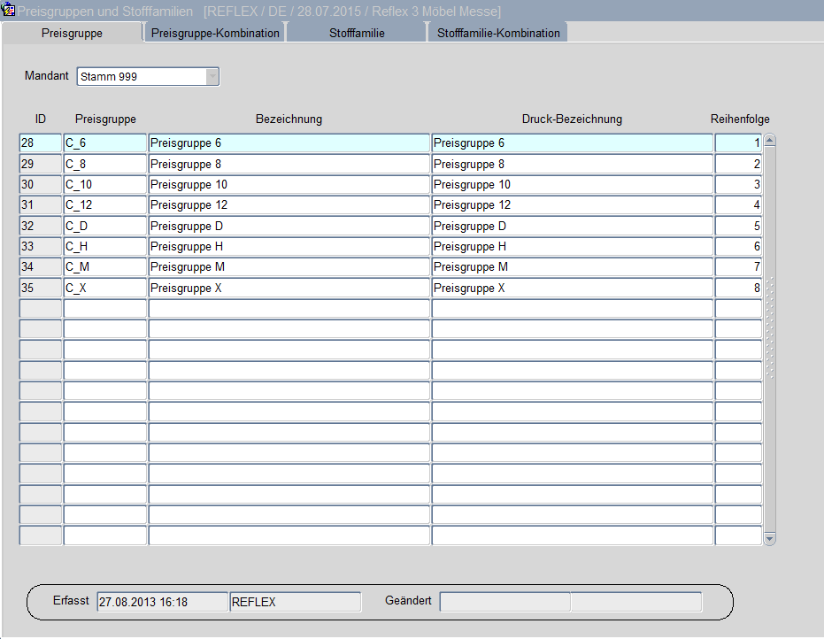 Hier können nicht nur die Preisgruppen verwaltet werden, sondern auch die Stofffamilien, Preisgruppen- und Stofffamilienkombinationen in den weiteren Registerkarten. Die Preisgruppen können in den Stammdaten der Basisartikel zugeordnet werden. In der Preisverwaltung können wiederum Preise für Artikel in verschiedenen Preisgruppen hinterlegt werden. Die höchste Reihenfolge bedeutet gleichzeitig die höchste Preisgruppe.