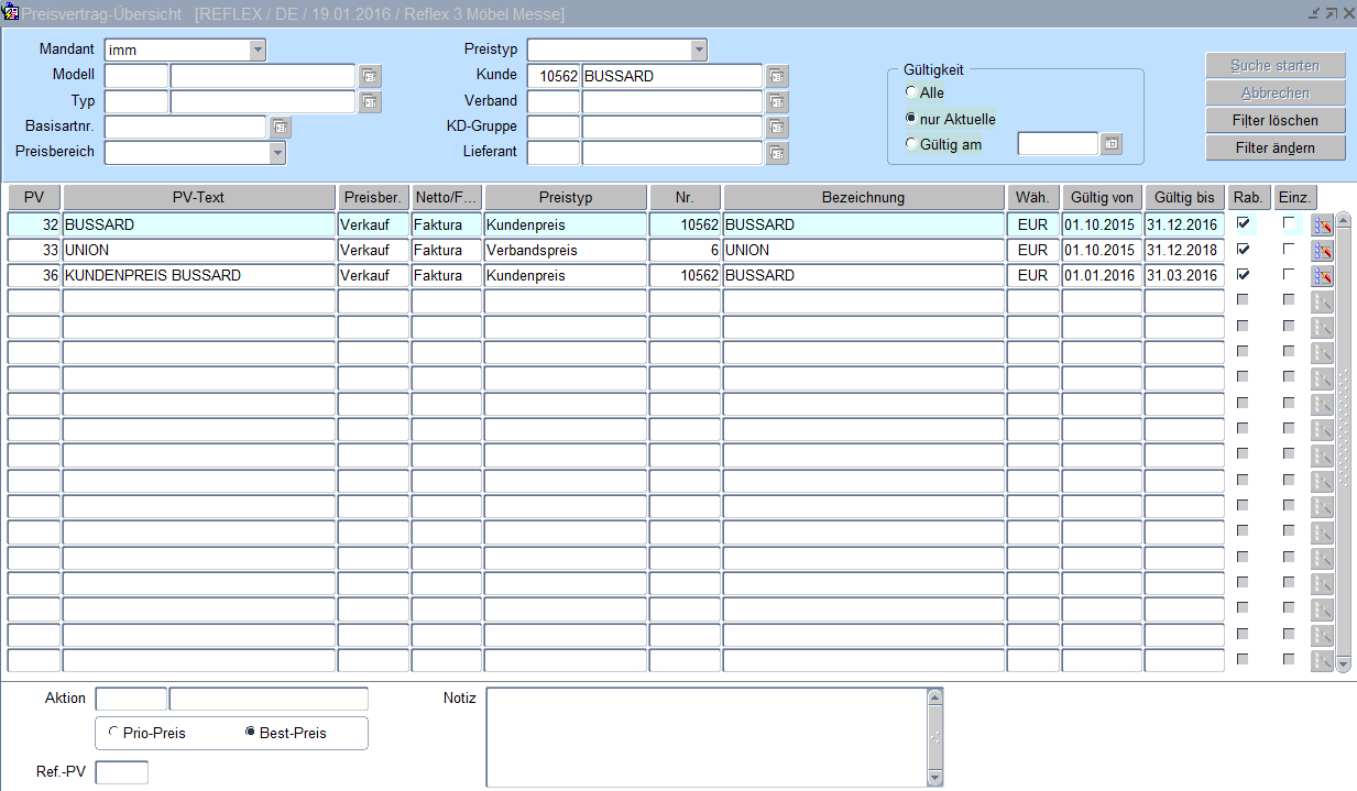 Sämtliche Preisverträge eines Kunden, einer Kundengruppe, eines Verbandes oder eines Lieferanten können hier gesichtet werden. Die Voreinstellung des Filters ist so gesetzt, dass nur aktuelle Preisverträge angezeigt werden. Die Selektion kann jedoch jederzeit angepasst werden.