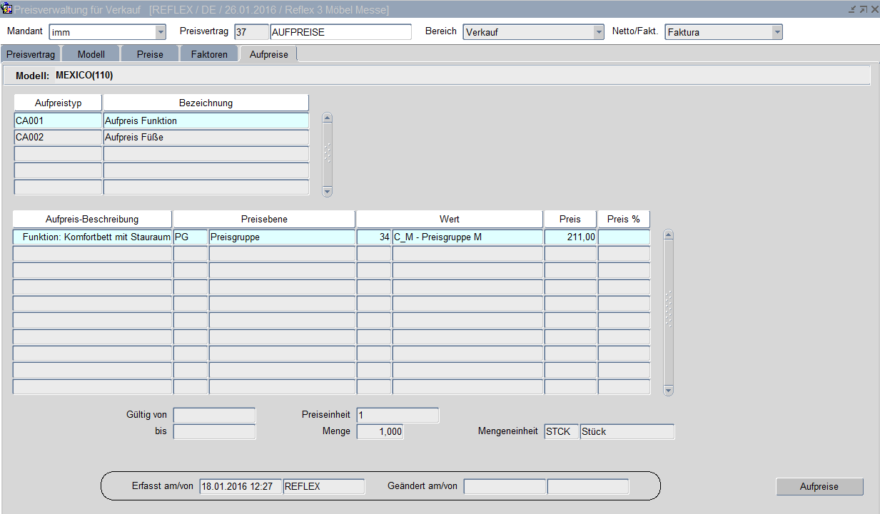 Bezeichnung der Aufpreistypen. Auflistung der Aufpreistypen, die für dieses Modell gespeichert sind.
