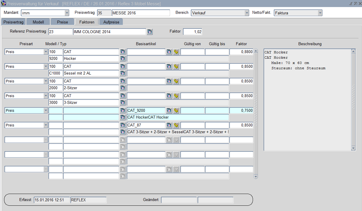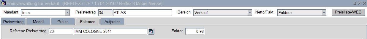 Anhand eines Faktors und eines Referenz-Preisvertrages errechnet sich der Preis neu. Der Faktor kann sich entweder auf den gesamten Referenz-Preisvertrag oder nur auf bestimmte Modelle / Typen bzw. Basisartikel beziehen. Ob überhaupt mit Faktoren gearbeitet werden soll, kann in den Systemeinstellungen gesteuert werden - so wird bei einer negativen Eingabe in den Systemparametern die Registerkarte Faktoren auf inaktiv gesetzt und ist in der Form nicht wählbar.