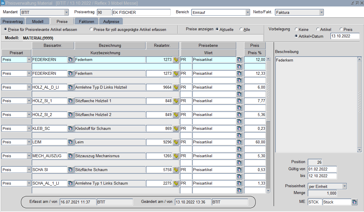 Die Preisermittlung berücksichtigt alle oben beschriebenen Preisspeicherungsformen. Die Gültigkeit des Preisvertrages wird anhand des erfassten Bestelldatums des Auftrages geprüft. Bei Erfassung der Preise wird der Artikel nach der Eingabe des ersten Datensatzes vorbelegt, so dass die Preiserfassung für einen Artikel mit z. B. unterschiedlichen Preisgruppen erleichtert wird.
