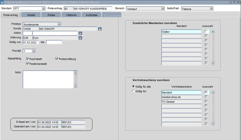 Gespeichert wird der Preisvertrag für einen bestimmten Mandanten im Preisvertragskopf. In der Registerkarte Preisvertrag können noch weitere Mandanten zugeordnet werden, für die der Preisvertrag ebenfalls gelten soll. Damit die unterschiedlichen Preise für gleiche Modelle in Abhängigkeit der Vertriebsschiene verwaltet werden können, werden Preisverträge nicht nur mandantenabhängig, sondern auch vertriebsschienenabhängig verwaltet. Ein Preisvertrag kann dann entweder als "gültig für alle" (Vertriebsschienen) gekennzeichnet oder für bestimmten Vertriebsschienen zugeordnet werden.