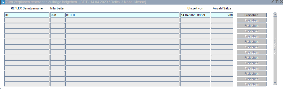 Mit der Form „Prodplan Look Freigabe“ erfolgt keine Prüfung ob der Anwender sich tatsächlich noch in der Anwendung Planung befindet. Die Daten werden mit der Freigabe grundsätzlich gelöscht. Sollte der Anwender zu diesem Zeitpunkt noch in der Anwendung Planung sein, kann er nicht weiterarbeiten und alle zuvor ausgeführten Tätigkeiten gehen verloren.