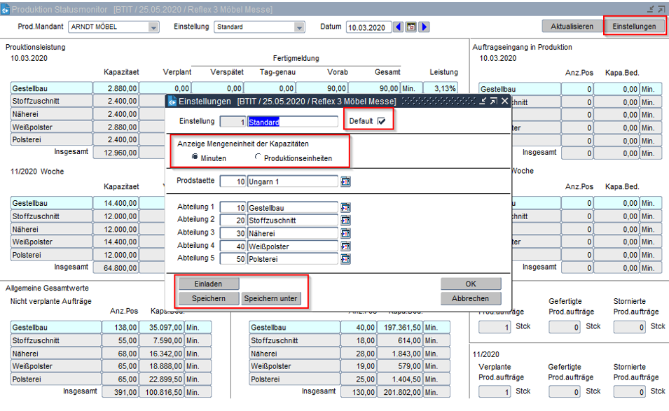 Mit dem Button „Speichern unter“ kann man eine neue bzw. weitere Einstellung speichern. Über den Button „Speichern“ kann man zu einer bereits bestehenden Einstellung die erfassten Änderungen speichern. Über den Button „Einladen“ kann man eine andere bereits gespeicherte Einstellung wählen und übernehmen.
