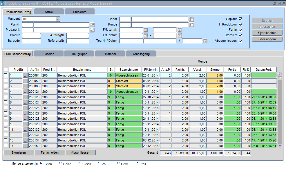 ProduktionAuskunft Produktionsauskunft Über die Produktionsauskunft mit den vielen Filtermöglichkeiten besteht eine gute Auskunftsmöglichkeit der bestehenden bzw. abgeschlossenen oder auch stornierten Produktionsaufträge.