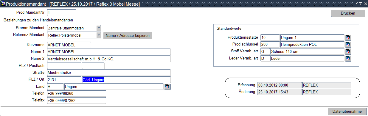 Über den Button "Drucken" können die Daten des angezeigten Produktionsmandanten gedruckt werden.