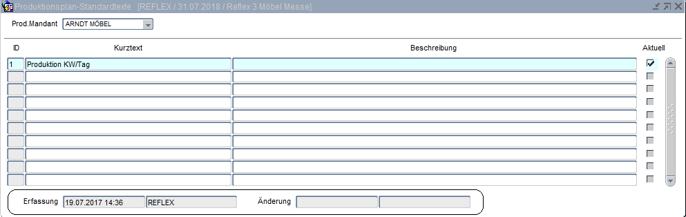 Die Produktionsplan-Standardtexte können hier gepflegt werden - bei Verplanung eines Auftrages in die Produktion kann man einen bestehenden Produktionsplan wählen oder eine neue Plan-Nr. erstellen. Hierbei greift das Programm auf den Kurztext sowie der Beschreibung zu.