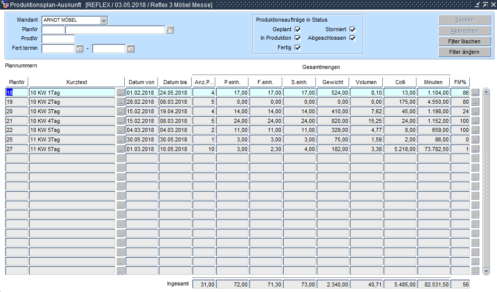 Die Ermittlung der anzuzeigenden Produktionsplannummern wird mandantengenau über verschiedenen Suchkriterien durchgeführt. Die Suche nach den Produktionsplänen erfolgt bei keiner Eingrenzung über den Status der Produktionsaufträge über alle Produktionsaufträge.