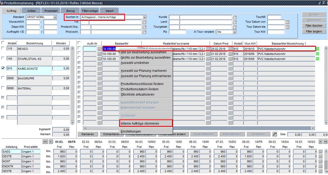 Interne Produktionsaufträge können storniert werden, indem die entsprechende Position markiert und über das Kontextmenü (rechte Maustaste) der Menüpunkt "Interne Aufträge stornieren" gewählt wird.
