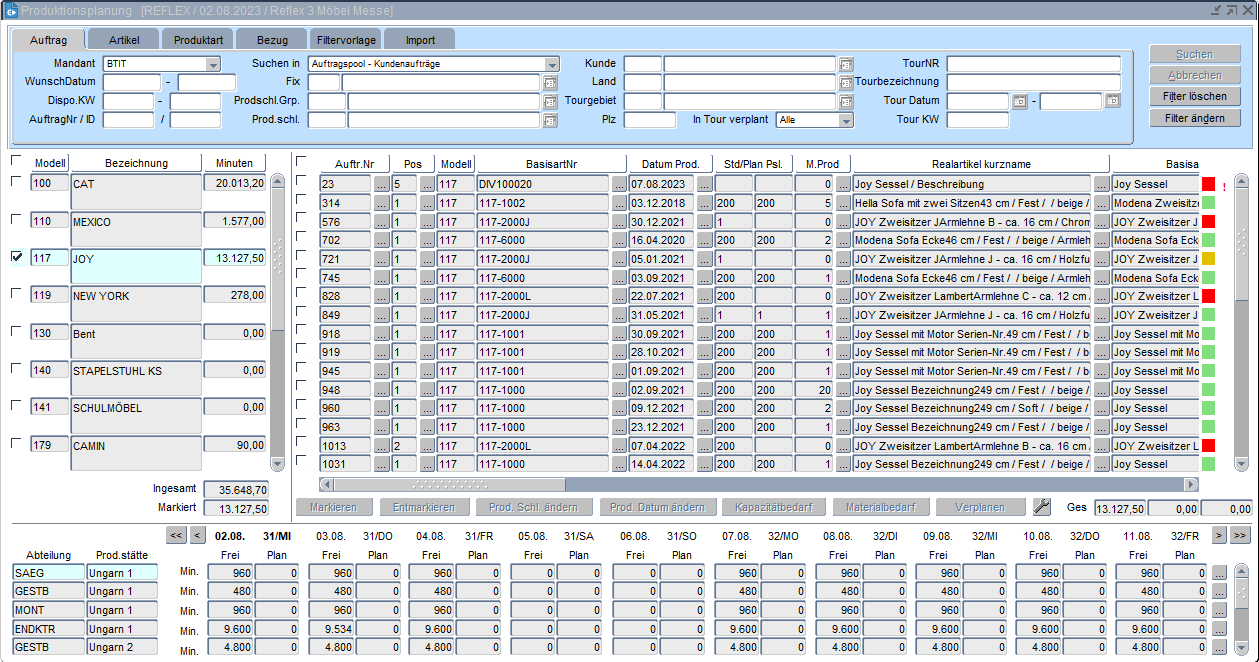 Nachdem die Aufträge über die Disponierung in die Produktion gelangt sind, können die Aufträge auch in dieser Maske für die Produktion verplant werden. Die erste Stücklistenauflösung passiert bereits bei der Disponierung der Aufträge - ist die Stücklistenauflösung aufgrund von falschen oder fehlenden Daten auf einen Fehler gestoßen, so kann dieses anhand des Ampelsystems erkannt werden. Die Stammdaten der rot und gelb gekennzeichnete Datensätze müssen aufgrund eines Fehlers überprüft werden. grün = verplanbar, gelb = fehlender Standard-Produktionsschlüssel (muss in Produktionsschlüssel je Modell/Typ angelegt sein), rot = Auftrag wurde nicht bestätigt (genaue Fehlermeldung im Auftragspool erkennbar).
