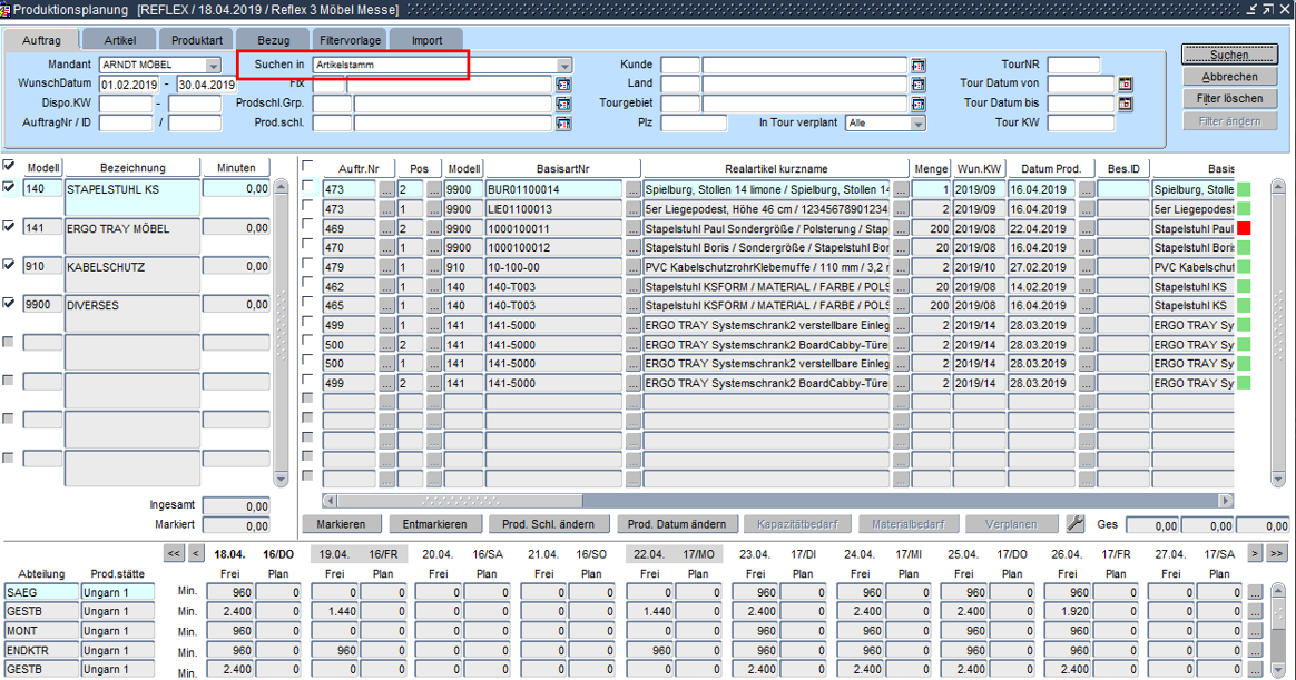 Hierfür muss im Filterbereich der Form Planung im Feld "Suchen in" „Artikelstamm“ gesucht werden.