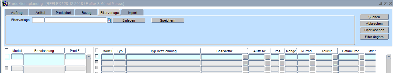 Die Filtervorlage kann über die Werteliste gewählt werden. Das Einladen der Suchkriterien des jeweiligen Filters passiert über den gleichnamigen Button.