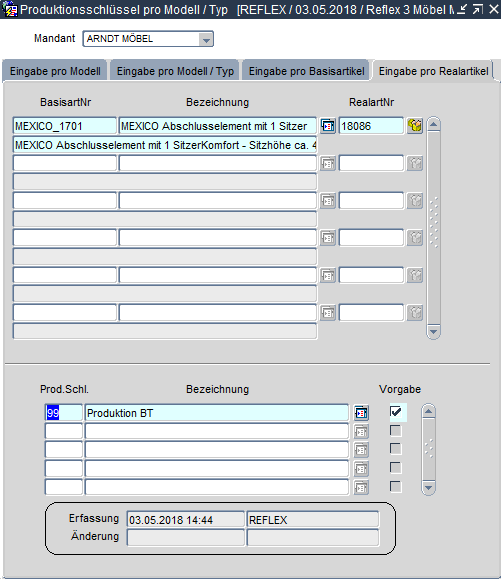 Produktionsschluessel - Eingabe pro Realartikel