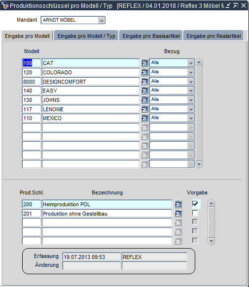 In dieser Maske sind den Modellen sämtliche Produktionsschlüssel zuzuordnen, die für das jeweilige Modell in Frage kommen. Mit der Kennzeichnung unter Vorgabe wird der standardmäßige Produktionsschlüssel zugeordnet mit dem der Auftrag in die Planung einfließt. Dieser Wert muss mindestens gesetzt werden. Um die Zuordnung weiter einzuschränken, kann die Eingabe auch über Modell/Typ, je Basisartikel oder auch für ein Realartikel in den weiteren Registerkarten eingegeben werden. Wird bei der Vergabe des Produktionsschlüssels noch nach der Bezugsart Stoff und Leder unterschieden, kann in der Spalte "Bezug" die jeweilige Option eingegeben werden. Hier handelt es sich um eine Vorbelegung für die Übergabe der Produktionsaufträge von der Disposition zur Produktion, die bei Produktionsplanung der Aufträge angepasst werden kann.