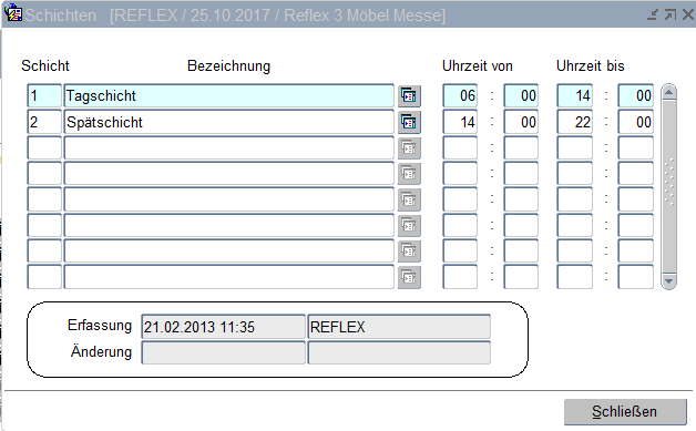 Über den Button Schichten, sind die vorhandenen Schichten der Produktionsstätte und die Arbeitszeiten zu pflegen.