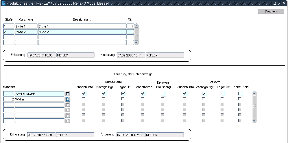 Hier werden sogenannte Stufen definiert, die dann wiederum den einzelnen Abteilungen zugeordnet werden können. Je Produktionsstufe kann bestimmt werden, ob bestimmte zusätzliche Informationen auf der Arbeitskarte oder Leitkarte gedruckt werden sollen. Die Produktionsstufen werden beim Druck der Produktionsunterlagen mitgegeben.