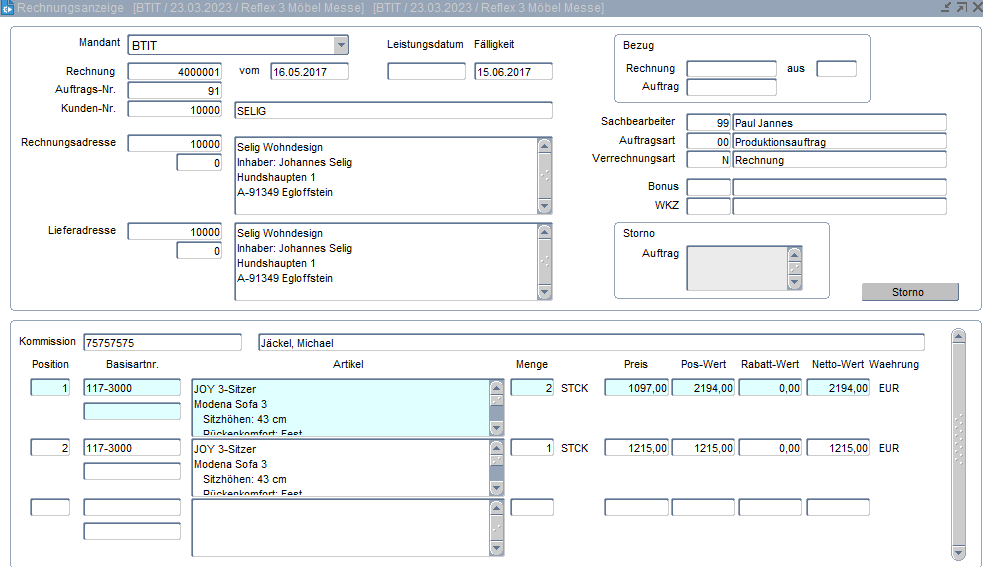 Nach Betätigung des Buttons „Storno" wird der neue Auftrag (für die Gutschrift - eine Rechnung mit gleicher Position und gleichem Wert) automatisch vom System erstellt und muss nur noch mit der Auftragsprüfung abgeschlossen werden. Die Auftragsart wird über die Anwendung „Auftragssteuerung" festgelegt.