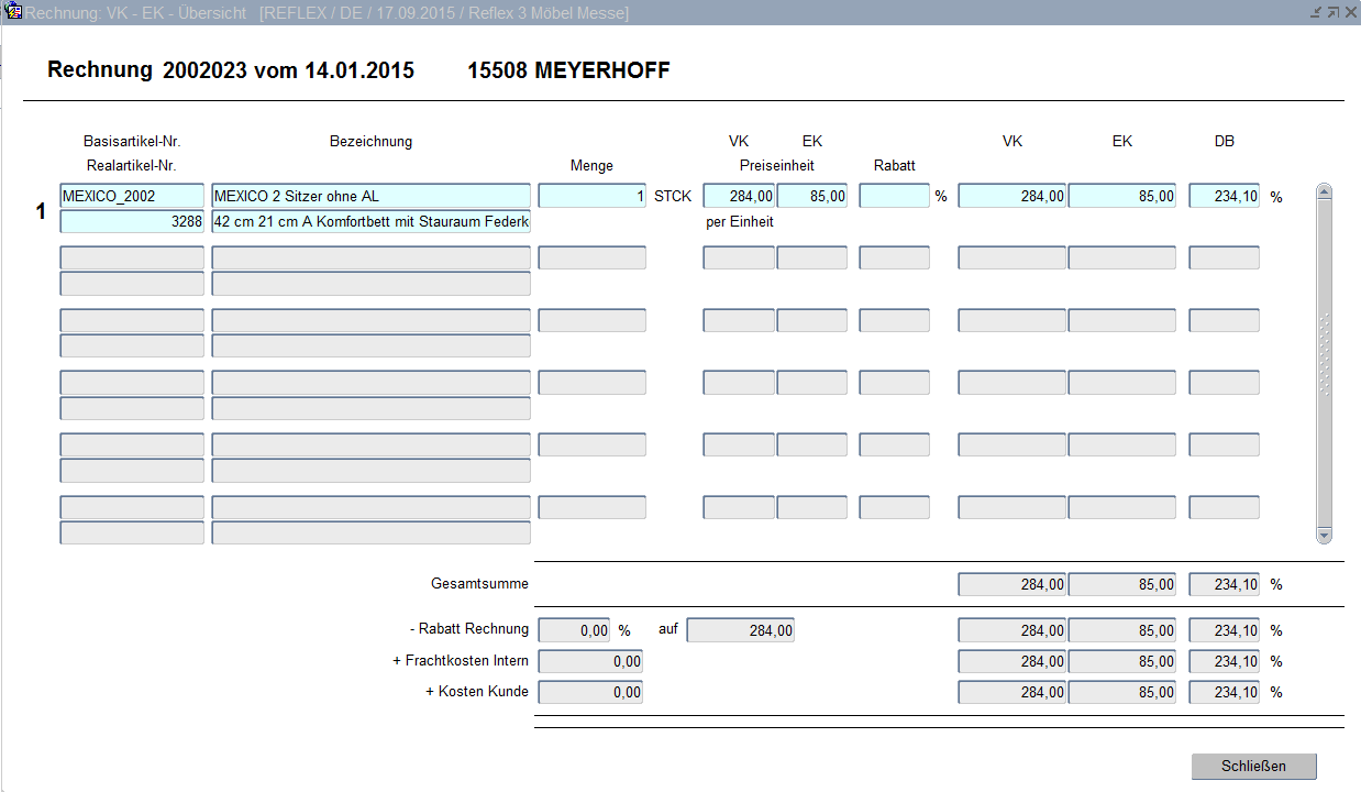 In der Form VK-EK-Übersicht werden die Einkaufs- und Verkaufswerte gegenüber gestellt und der Deckungsbeitrag angezeigt.