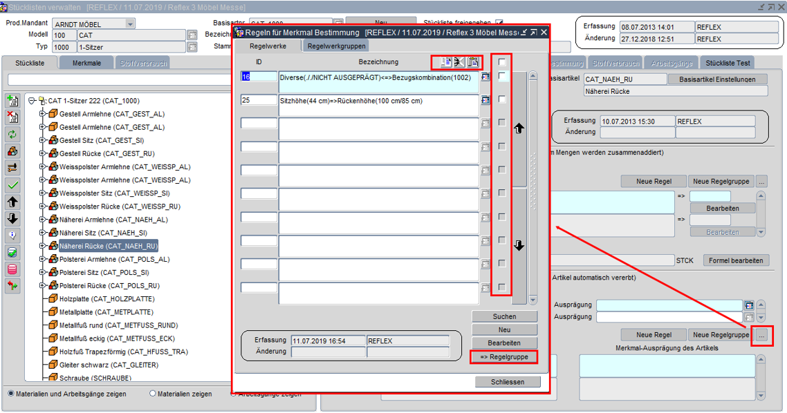 Mit Hilfe einer weiteren Hilfsfunktion kann die Regel-Liste, die einer Baugruppe einzeln zugeordnet ist, in eine Regelgruppe umgewandelt werden. Diese Funktion ist hilfreich, wenn bei mehreren Baugruppen die gleichen Regeln benötigt werden und ein mehrfacher Pflegeaufwand wie z.B. bei Änderungen vermieden werden soll. Wenn aus Regeln eine Regelgruppe generiert wird, können danach nicht nur die einzelnen Regeln (die auch 50-100 Regeln beinhalten können) zu jeder betroffenen Baugruppe, sondern nur die Regelgruppe zugeordnet werden. Somit muss nur die Regelgruppe gepflegt werden, die Änderungen werden bei den betroffenen Baugruppen durchgeführt.