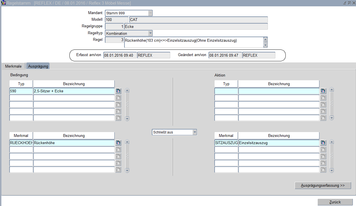 Die Regeln werden pro Modell verwaltet und in der Form Bedingung 🡪 Aktion definiert. Als Bedingung bzw. Aktion können Typen oder Merkmale angegeben werden. Sollen Bedingungen für Merkmalsausprägungen gespeichert werden, so wechselt man nach dem Erfassen von Typ und Merkmalen über den Button "Ausprägungserfassung" auf die Registerseite "Ausprägung"