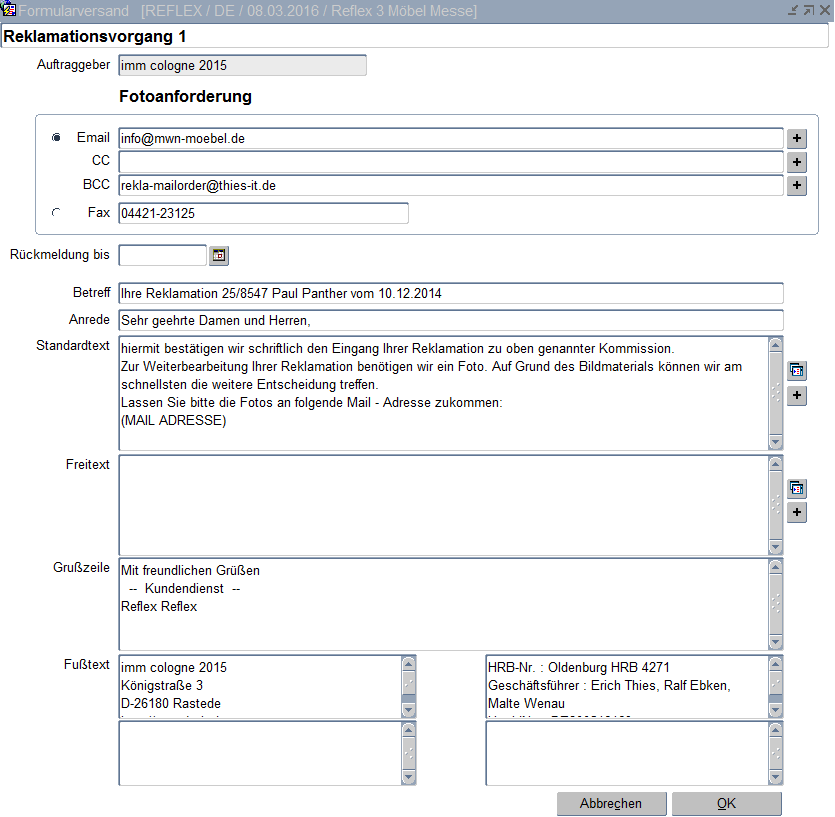 Eingangsbestätigung: Es wird ein Fenster zum Anstoß des Standardschreibens „Reklamationsbestätigung" aufgerufen.