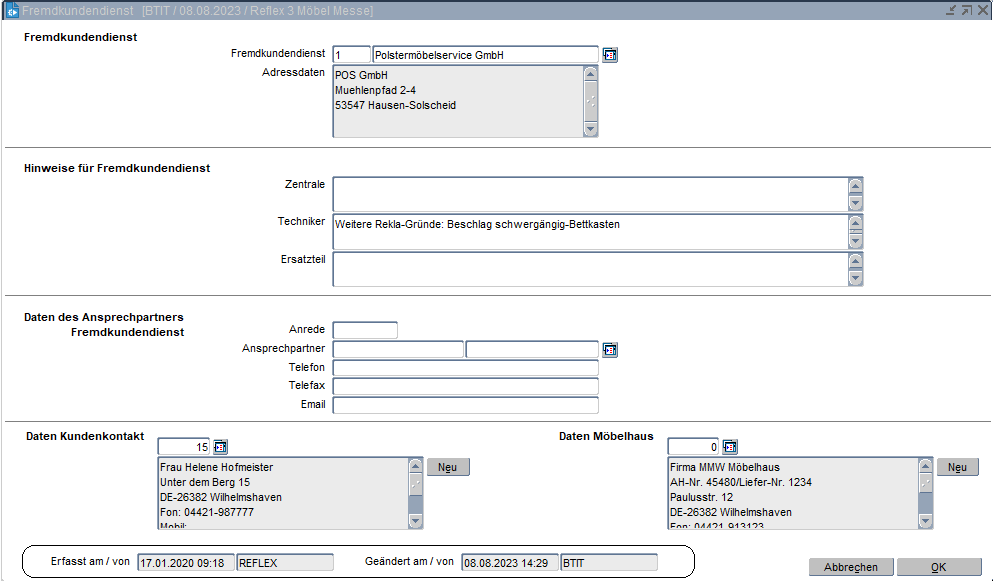 Mit dem Button OK werden die Daten zum Fremdkundendienst in den Reklamationsvorgang übernommen.