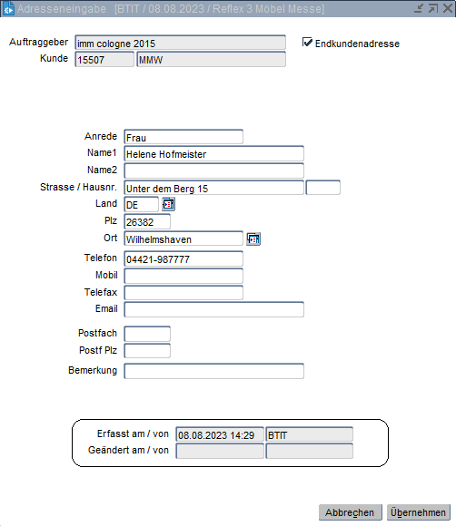 Adresse des Fremdkundendienstes. Anzeige der gespeicherten Adresse aus den Kundendienststammdaten.