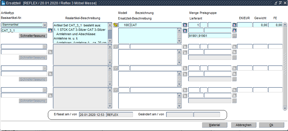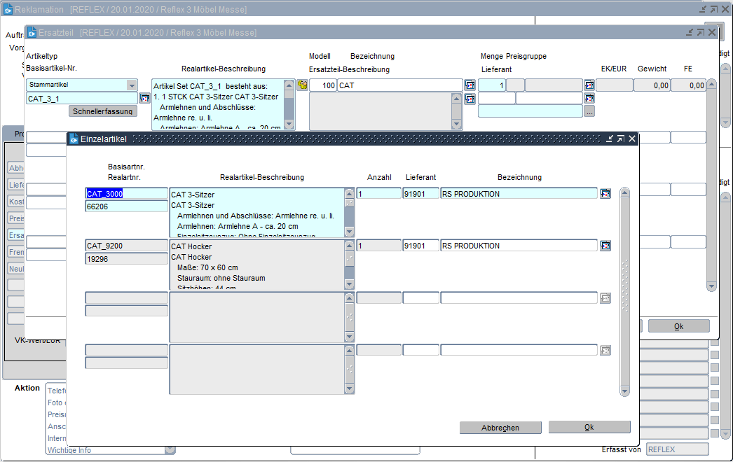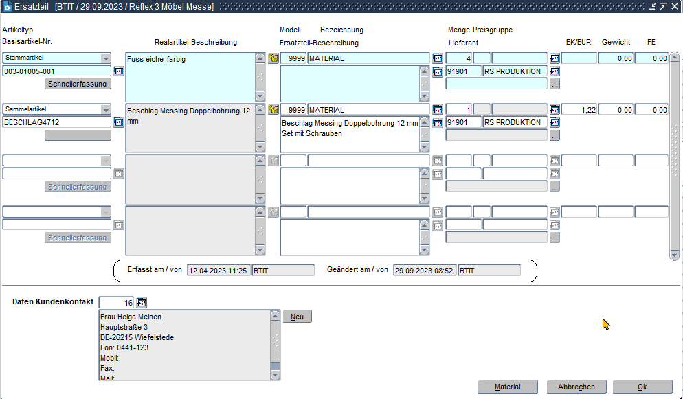 Ist die Entscheidung für eine Ersatzteillieferung gefallen, so wird aus diesem Reklamationsvorgang eine Ersatzteillieferung angestoßen. Es kann eine Ersatzteillieferung mit oder ohne Berechnung ausgelöst werden. In dieser Maske werden Detailinformationen zu einer Ersatzteillieferung erfasst. Hier wird von einer manuellen Erfassung der Ersatzteildaten ausgegangen. Hierbei kann es sich um einen Basisartikel, einen Bezug oder um einen Sammelartikel, der detailliert nur in Textform erfasst wird, handeln.