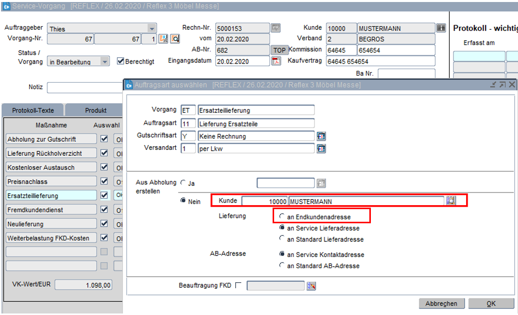 Für die Ersatzteilerfassung besteht die Möglichkeit, dass der Auftrag unter einer anderen Kundennummer erfasst werden kann. Für den Auftrag kann zusätzlich entschieden werden, ob die Lieferung an die Endkundenadresse erfolgen soll.