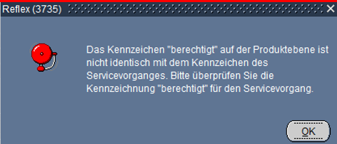 Weicht die Kennzeichnung des Produktes von der Kennzeichnung des Servicevorgangs ab, so wird ein Hinweis ausgegeben. Die Entscheidung, ob das Kennzeichen im Servicevorgang dann geändert werden muss, muss der Anwender treffen und das Kennzeichen dann evtl. manuell setzen.