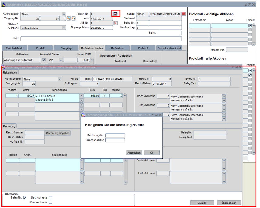 Die Anwendung Reklamationsvorgang ist in verschiedene Bereiche eingeteilt: Die Vorgangsdaten im oberen Bereich beinhalten die allgemeinen Daten zur Reklamation. Im rechten Bereich wird das Protokoll angezeigt.