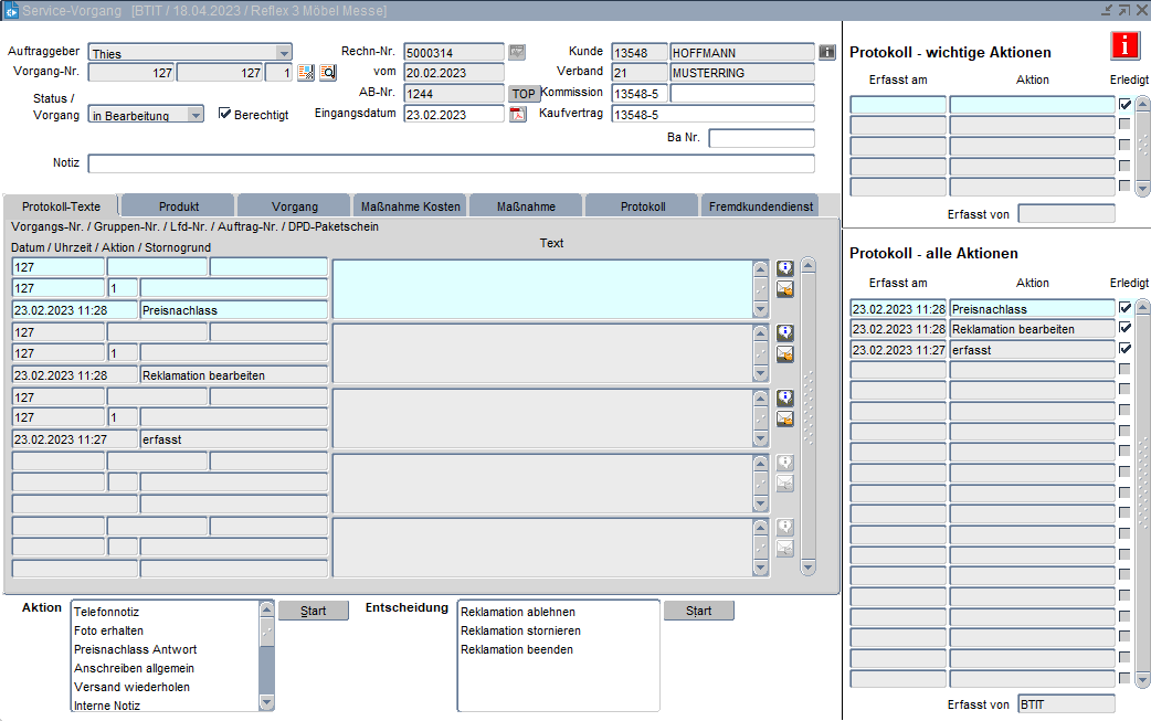 Mittig befinden sich die Registerkarten Protokoll-Texte, Produkt, Vorgang, Maßnahme Kosten, Maßnahme, Protokoll und Fremdkundendienst. Im unteren Bereich werden die Aktionen und Entscheidungen angestoßen.