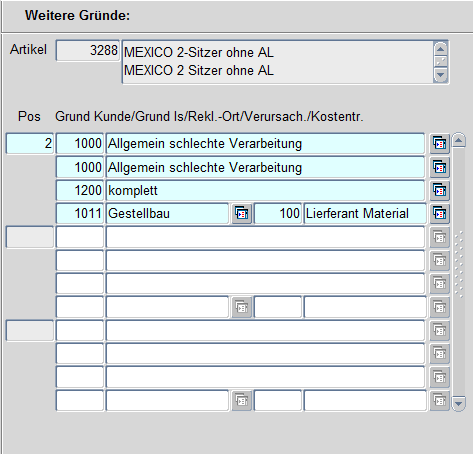 Zu jedem Artikel können mehrere Reklamationsgründe erfasst werden. Weitere Reklamationsgründe zu einer Rechnungsposition können in dieser Maske angegeben werden. Der erste Reklamationsgrund steht auf der Registerseite Produkt, der grün markierte Button rechts neben dem Reklamationsgrund zeigt an, dass es weitere Reklamationsgründe gibt.