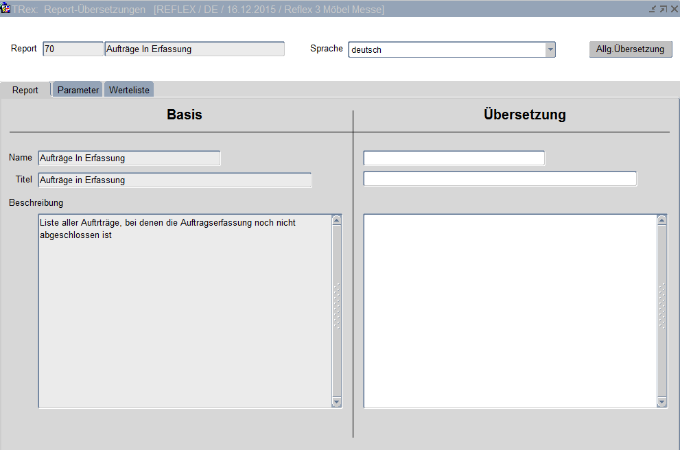 Admin ReflexTree-Report-Explorer (TRex)Pupup-Menue TRexAttributpaletteAttribut Sprache Report In dieser Registerkarte kann der Name Titel und Beschreibung übersetzt werden. Diese Übersetzungen sind an den Report (Report-Id) gebunden und gelten nur für diesen Report.