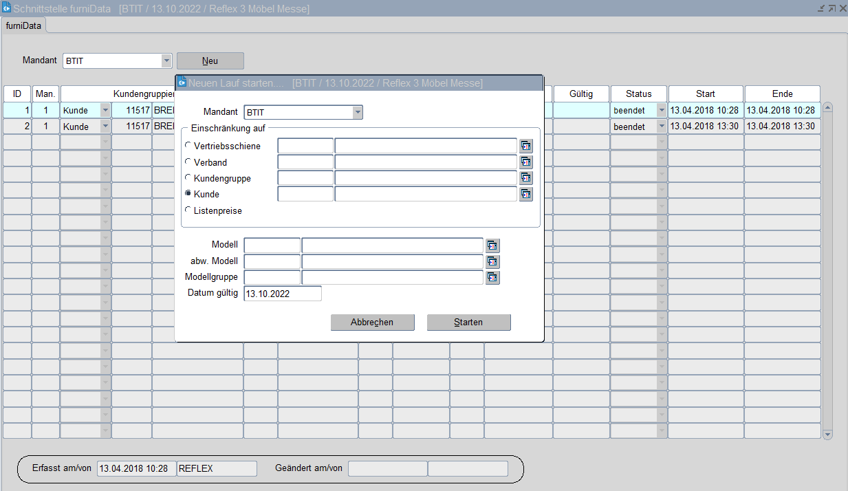 Für die Preisschnittstelle an furniData wurde eine Anwendung erstellt, in der der Anwender über den Button „Neu“ festlegen kann, für welchen Kunden und welche Modellgruppe oder welches Modell die Preisschnittstellentabellen gefüllt werden sollen. Mit dem Button „Starten“ wird das Befüllen der Preistabellen gestartet.