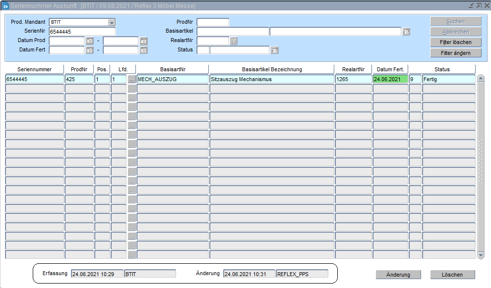 In dieser Anwendung können nach Eingabe verschiedener Suchkritierien die Serien-Nr. mit den entsprechenden Produktionsaufträgen, in dem sich die seriennummernpflichtigen Artikel befinden, angezeigt werden. Im oberen Block ist es möglich z.B.: nach der Seriennummer, Prod.Nr., Basisartikel, Realartikel-Nr. bzw. nach Produktions- oder Fertigmeldedatum. suchen. Über den Button "..." wird die Form Produktionsauftragsinfo mit dem entsprechenden Produktionsauftrag angezeigt. Über den Button "Änderung" kann die Seriennummer bis einschließlich Produktionsstatus 9 noch geändert oder gelöscht werden. Ab dem Status 10 ist das Editieren oder Löschen der Seriennummer nicht mehr möglich.