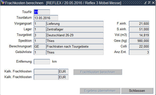 Angabe der gefahrenen Kilometer dieser Tour für eine evtl. Frachtkostenberechnung nach Entfernung (lt. Angabe in den Speditionsstammdaten oder in der Frachtkostenberechnung).
