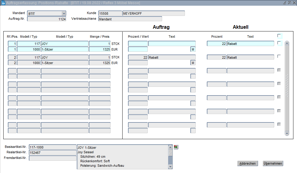 Auftrag = Hier werden die im Auftrag bereits hinterlegten Rabatte angezeigt.