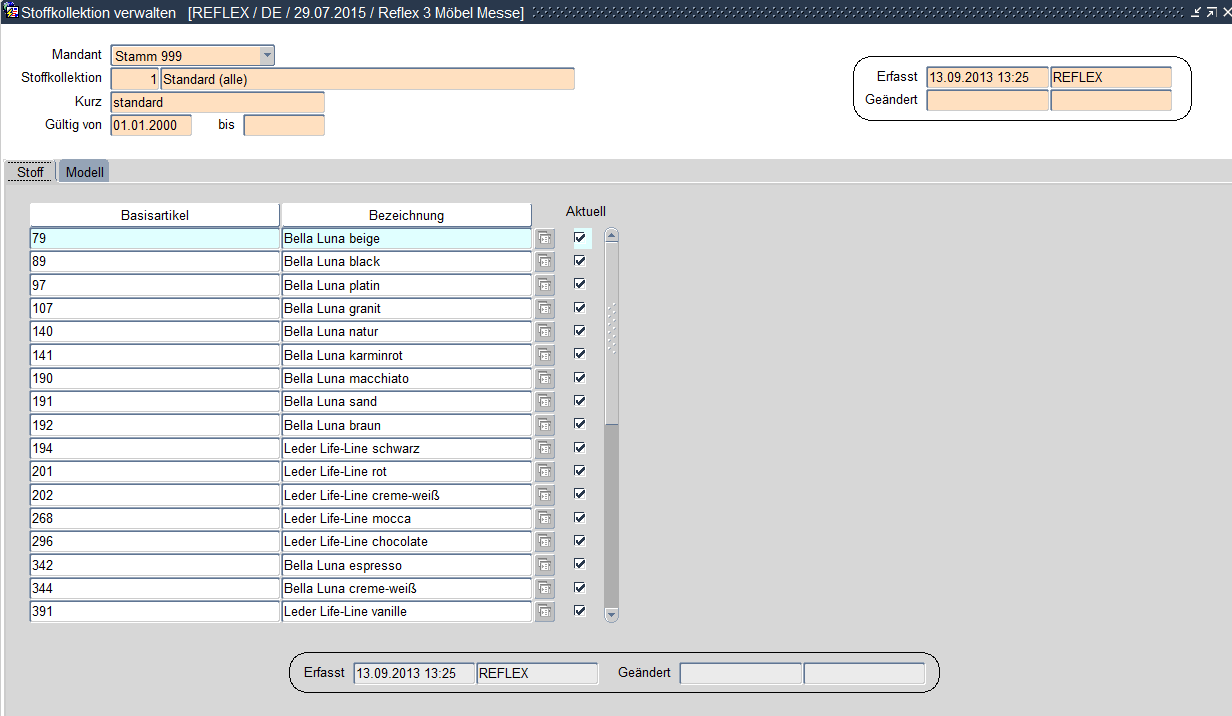 Hier werden die verschiedenen Stoffkollektionen gespeichert und gepflegt. Bei Eingabe neuer Leder/Stoffe im Basisartikel, kann die Zuordnung auch in der Registerkarte Stoff gespeichert werden. Für die Auswahl der Stoff- und Lederbezüge der verschiedenen Möbelstücke in der Auftragserfassung muss eine Zuordnung von Stoffkollektionen zu den Modellen erfolgen. Sind grundsätzlich alle Leder/Stoffe für ein Modell gültig, so wird die Standardstoffkollektion (alle) dem Modell zugeordnet.