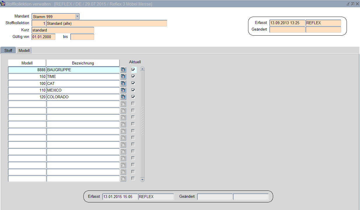 Welche Stoffkollektion für die verschiedenen Modelle gelten, kann entweder in dieser Maske definiert oder im Basisartikel angegeben werden. Für die Auswahl der Stoff- und Lederbezüge der verschiedenen Möbelstücke in der Auftragserfassung muss eine Zuordnung von Stoffkollektionen zu den Modellen erfolgen. Sind grundsätzlich alle Leder/Stoffe für ein Modell gültig, so wird die Standardstoffkollektion (alle) dem Modell zugeordnet.