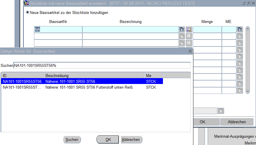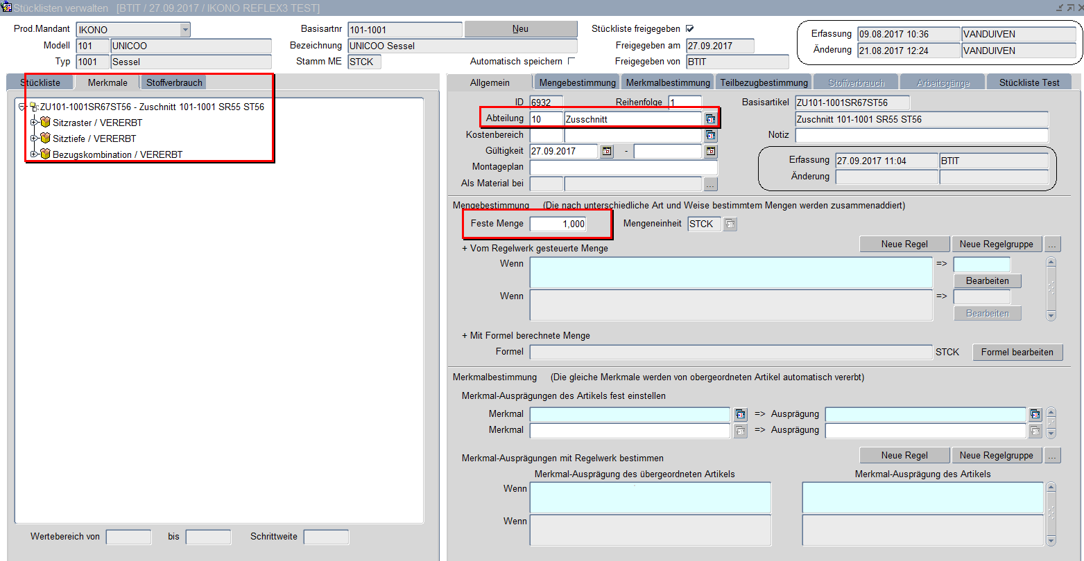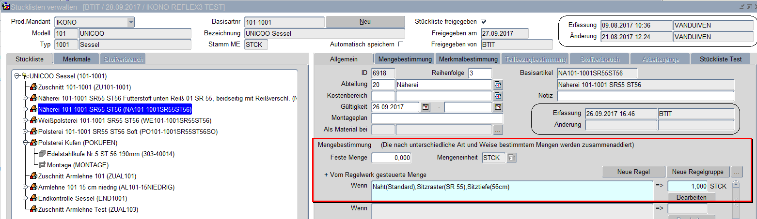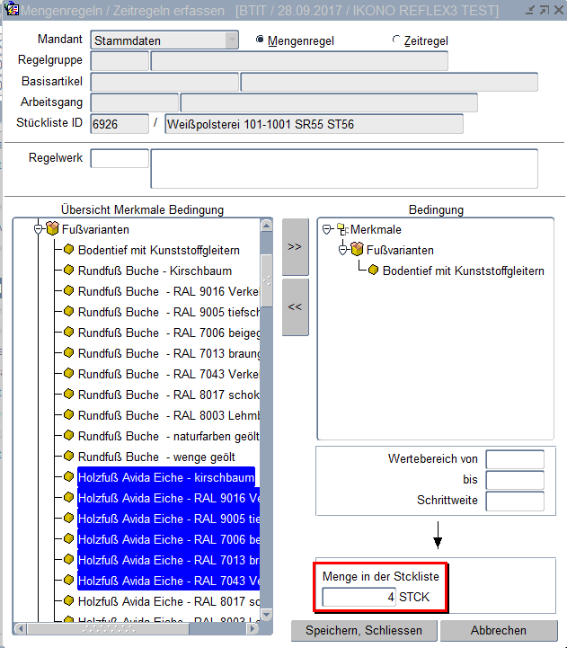 Mit einem Mausklick auf der Merkmalsausprägung und dem Pfeil bzw. mit einem Doppelklick mit der Maus wird die Bedingung übernommen. Mithilfe von Shift und einem Mausklick können ganze Bereiche von Ausprägungen übernommen werden. Unten in der Maske wird die Menge in der Stückliste hinterlegt, die in diesem Fall verwendet wird.