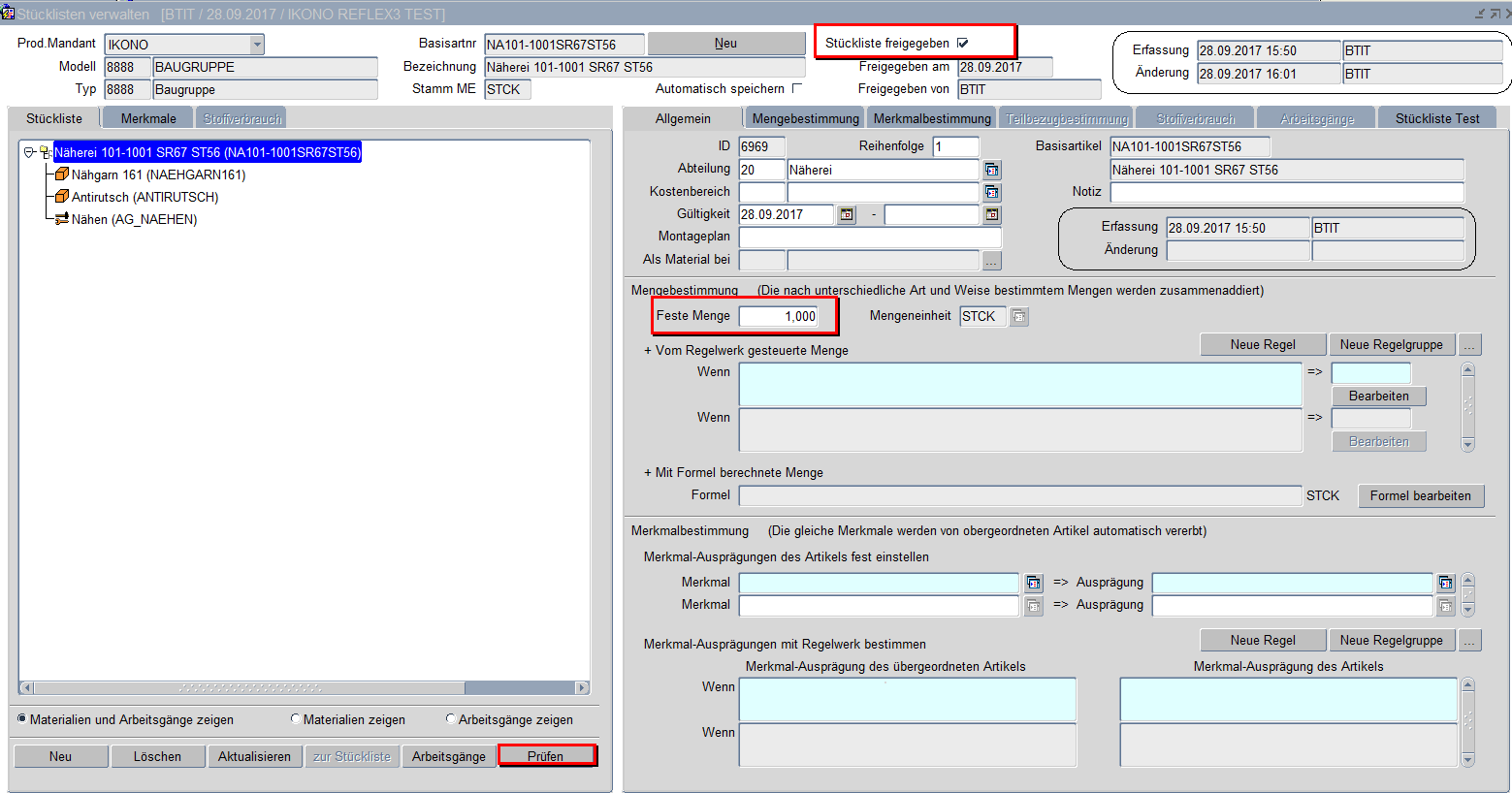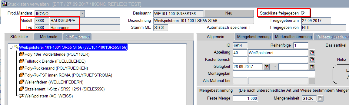 Achtung, wenn alles korrekt eingegeben und überprüft wurde, muss die Stückliste freigegeben werden. Danach kann das Fenster geschlossen werden und man befindet sich wieder in der übergeordneten Ebene.